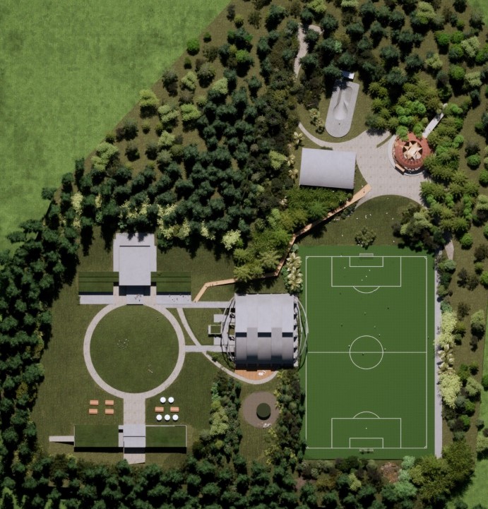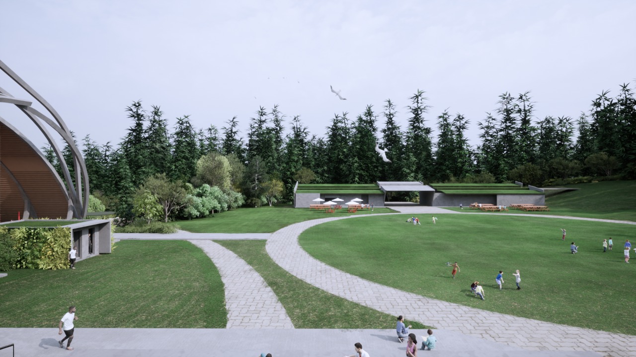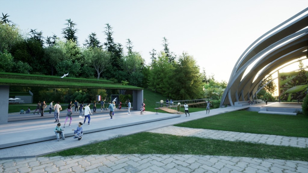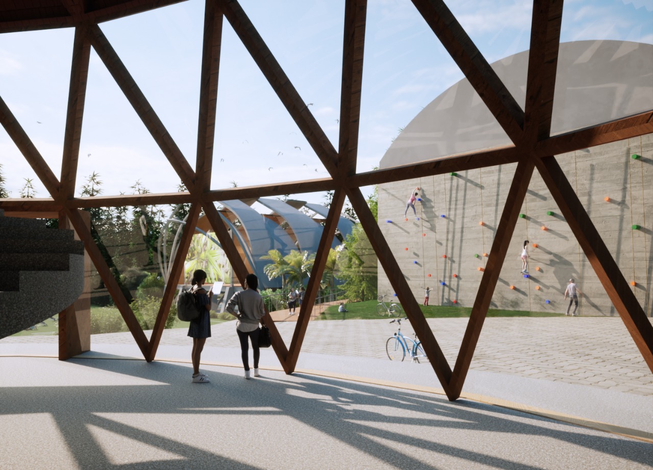O projeto arquitetônico abarca toda a extensão das fronteiras do terreno explorando possibilidades diversas de circulação e atividades ao ar livre: caminhadas entre e sob as arvores, arborismos, pistas de bicicletas e outros equipamentos.