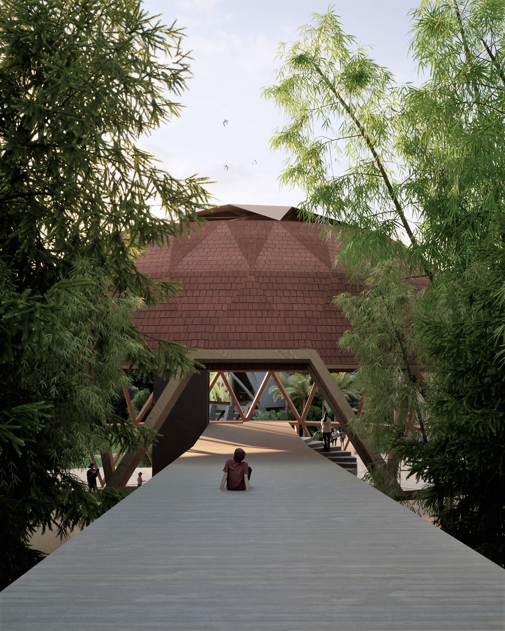 Projetado como arcos que se entrelaçam, o teto mimetiza as linhas e formas dos bambuzais. Seus forros poderão ser feitos deste próprio material. Os “arcos cruzados” simbolizam os encontros humanos em suas experiências de trocas, superações, desafios, brincadeiras, atividades em equipes e movimentos dos corpos.