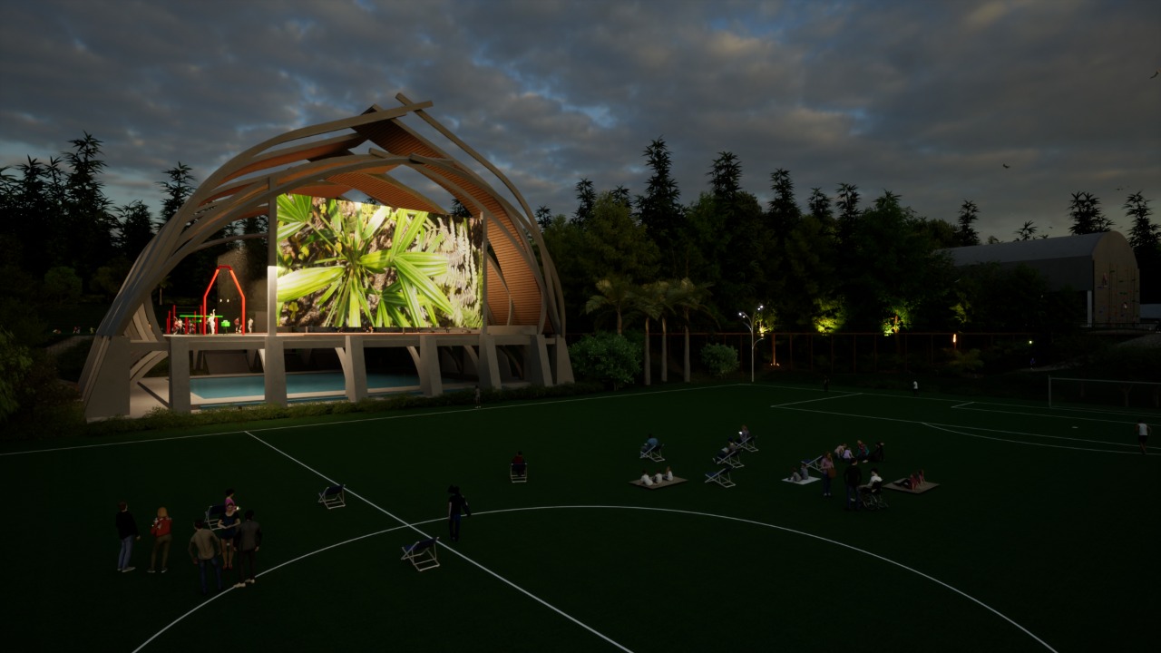 A quadra poliesportiva e sala de ginástica olímpica estão divididas por uma tela retrátil permitindo usos singulares e múltiplos assim como a adequação flexível às atividades e públicos. A tela de cinema é instalada em local apropriado para acolher grandes públicos acomodados no campo de futebol.